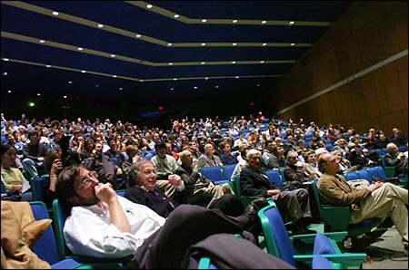 | Higgins Professor of Physics Emeritus Sheldon Glashow (left) listens to fellow Nobel Prize winner David Gross (right) talk about 'The Future of Physics' at the gathering in honor of Sidney Coleman. | |
